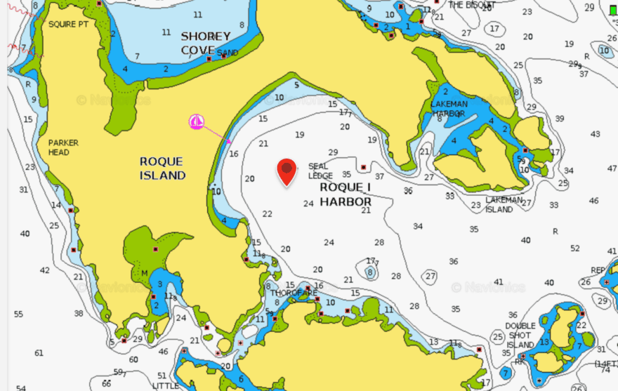 In building winds from any compass point to the east, anywhere from due south to due north, the tight refuge of Lakeman Harbor is the best alternative. Enter carefully into this protected cove and stay to the center once inside. The pond-sized bay shoals quickly but is predictable with good holding in mud. With the standard unrestricted lobster gear in abundance, only a handful of boats can shelter here effectively. While visiting Rogue Island, it is always best to listen to the daily updated weather forecasts and maintain a flexible attitude. This ensures a winning partnership for a good night’s rest.